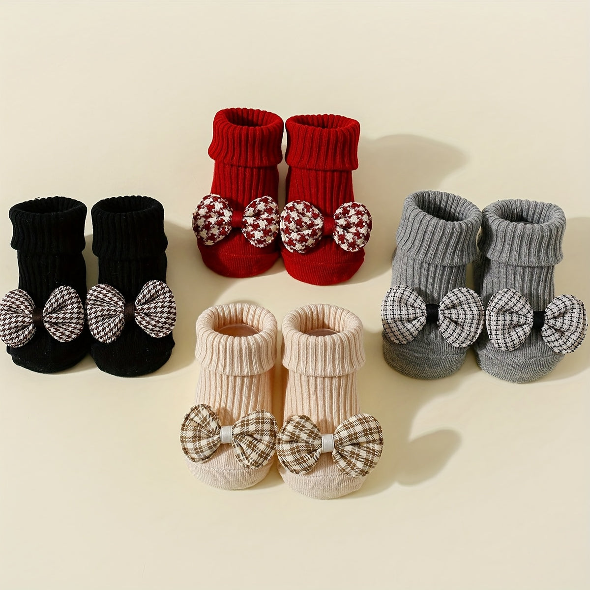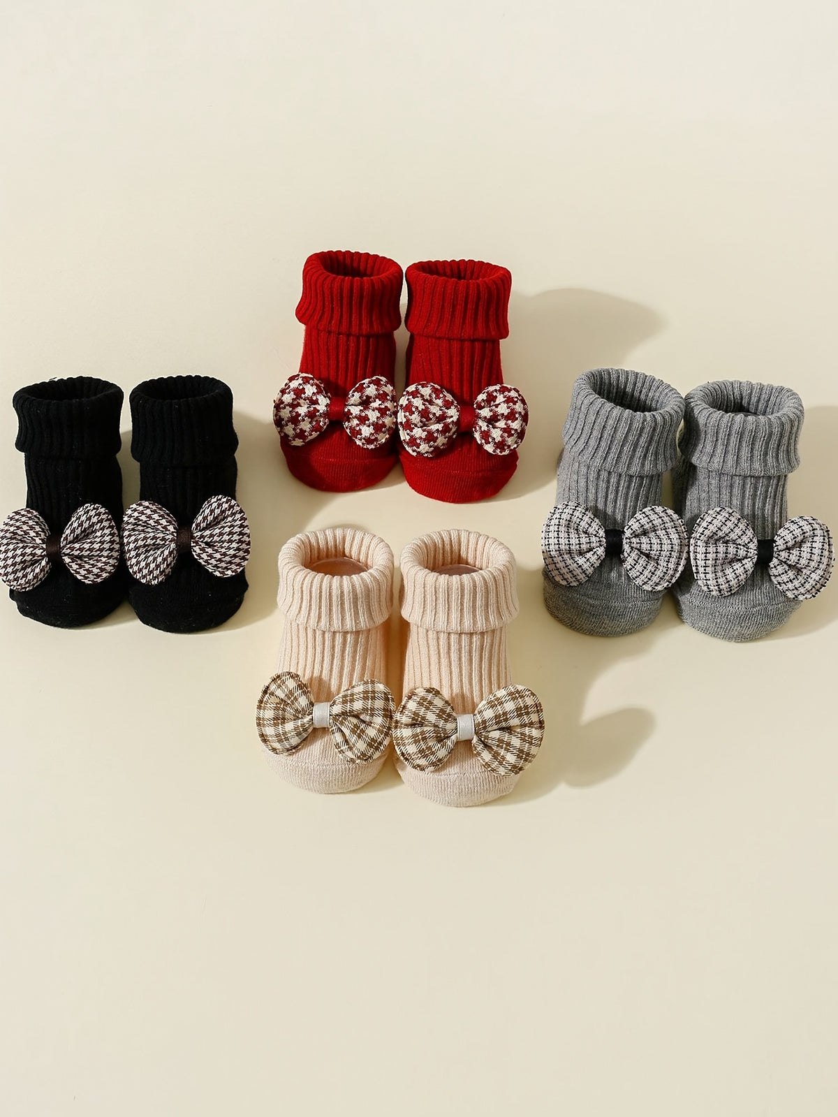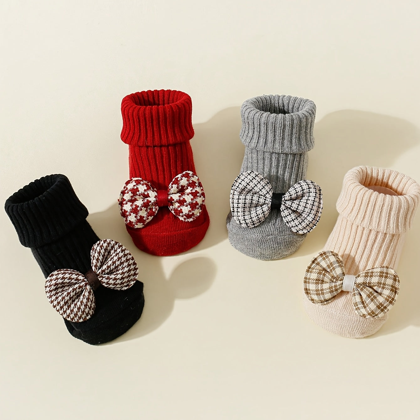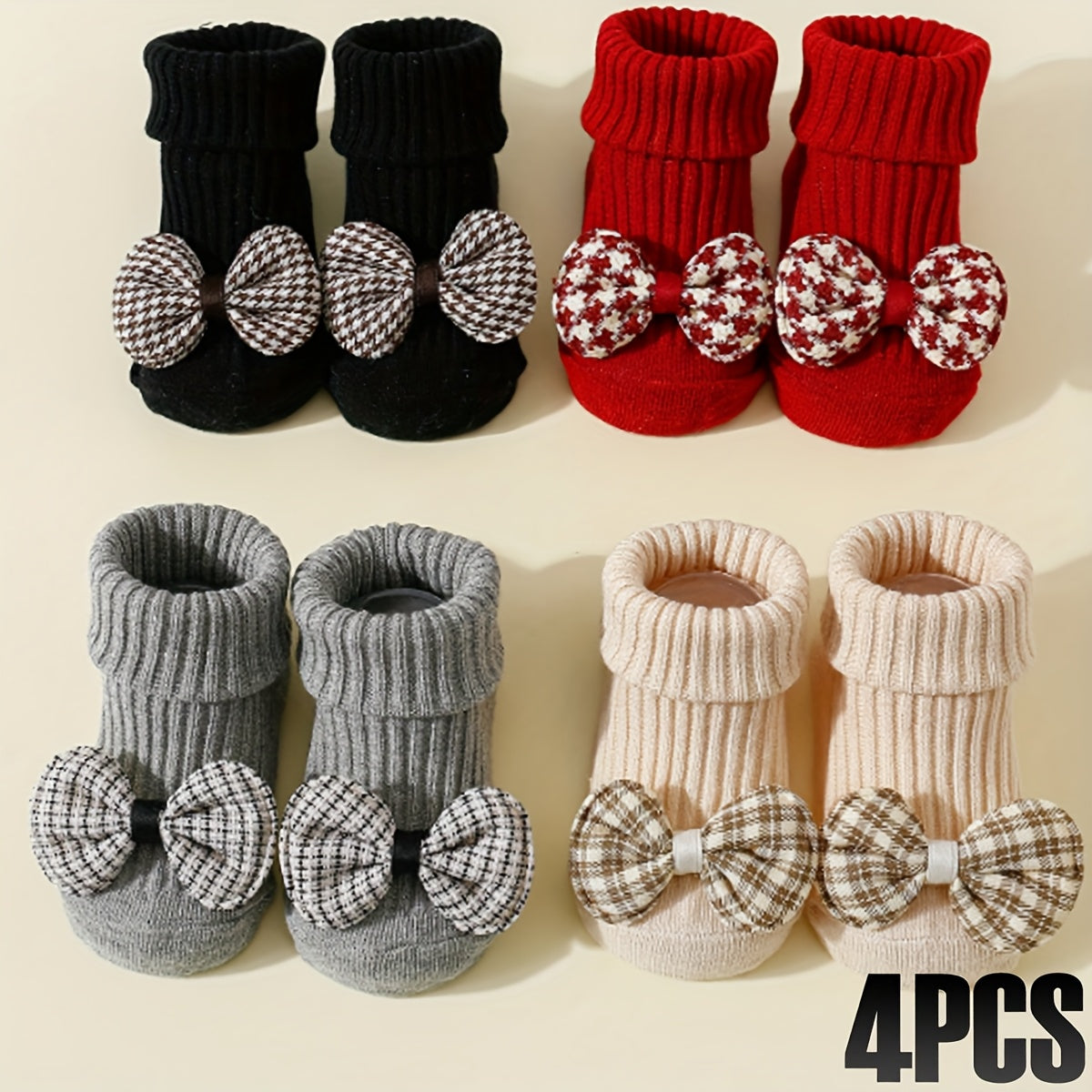 4 Pairs of Girls' Plaid Bow Mid-Calf Socks Non-Slip Dot Glue Mid-Calf Socks - 026 Sock Head Houndstooth Bow Tie 4/black Red Gray Card / 6-12M