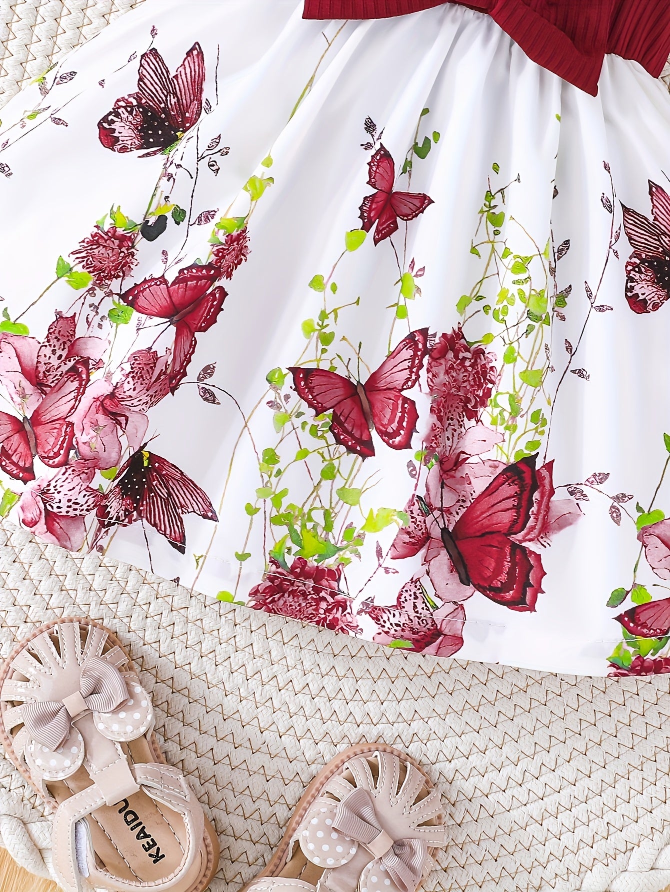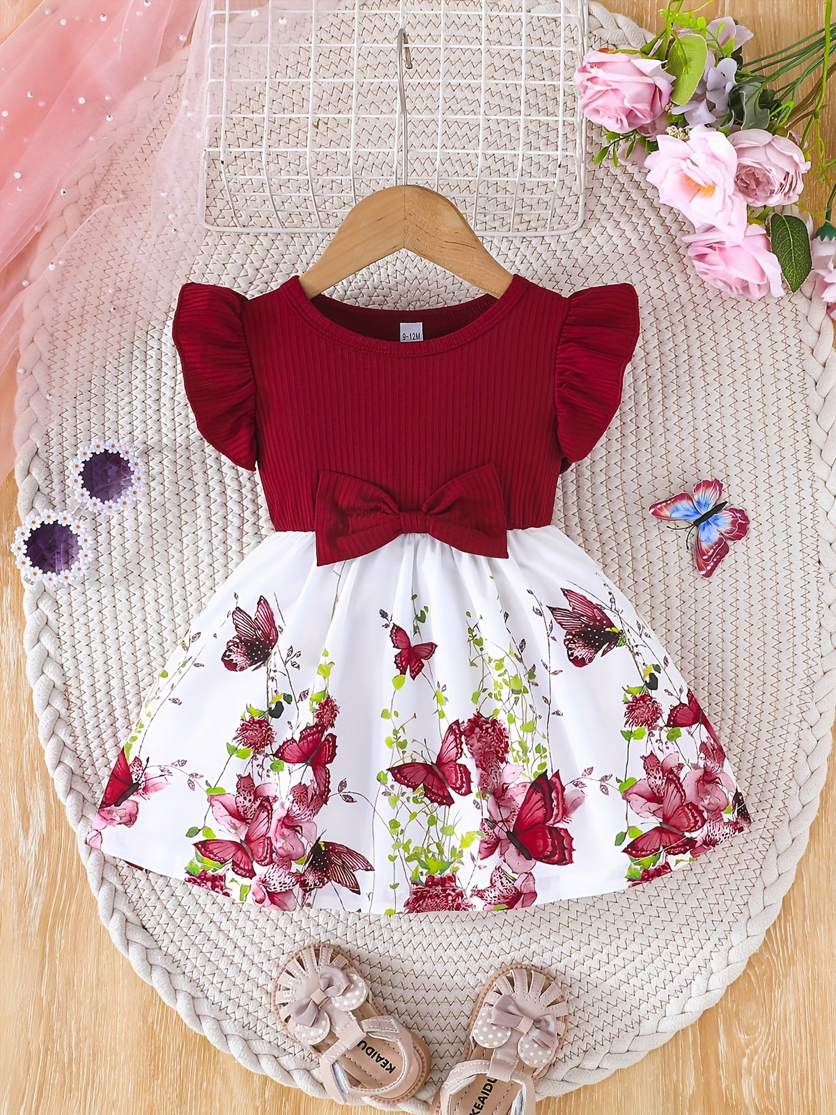 Girls' Spring/Summer Butterfly Print Dress with Bow Detail - Short Sleeve Round Neck A-Line Dress, Lightweight Breathable Fabric for Casual Outings & Playtime, Cute Toddler Dress, Playful Toddler Wear, Comfortable Toddler Wear - Deep Red / 6-9M